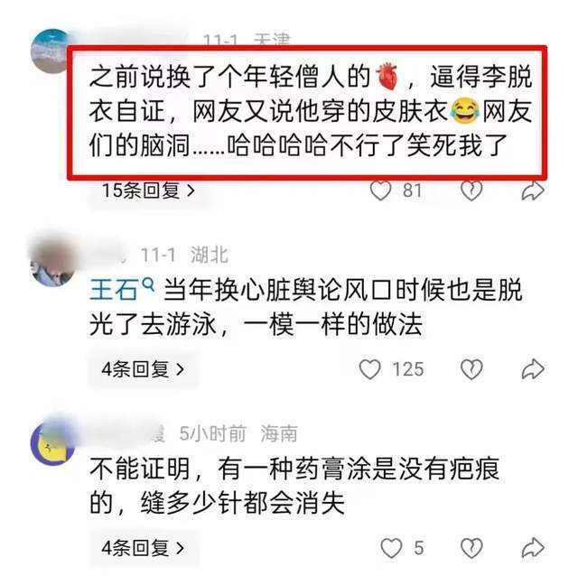 而他的一番自证清白引发评论区很多网友的支持,认为他非常坦然,尤其是生病显老病好后养好身体,62岁保持这样的身体状况很正常。但是依旧有部分网友拿着过度锐化的图全场找不同,非要认定李连杰穿了肉色的肌肤打底衣遮住了伤疤。